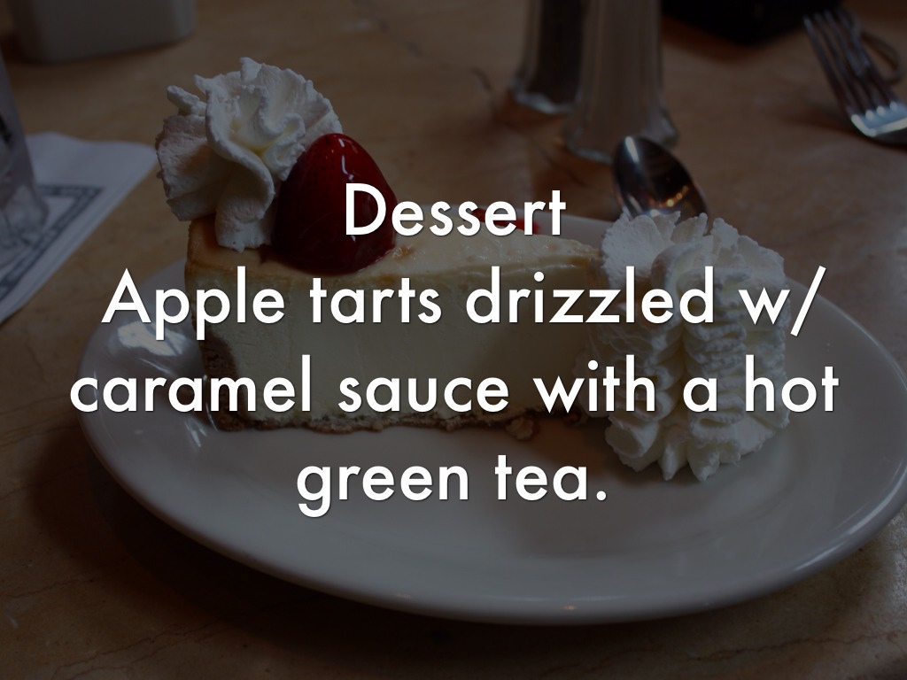 Apple tarts drizzled w/ caramel sauce with a hot green tea.