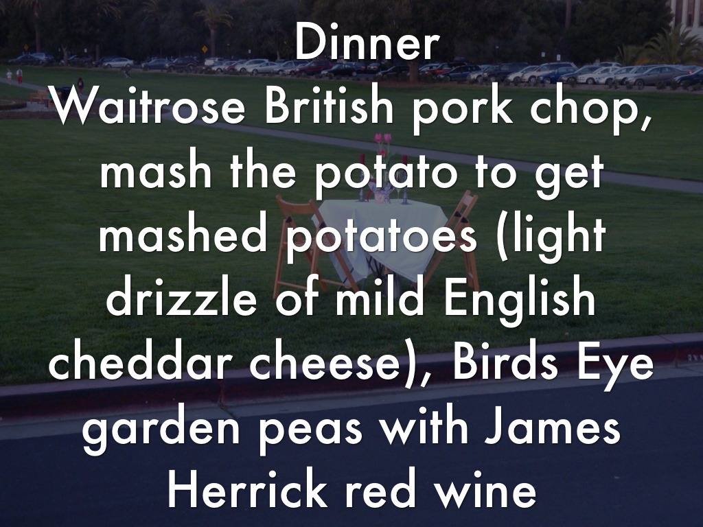 Waitrose British pork chop, mash the potato to get mashed potatoes (light drizzle of mild English cheddar cheese), Birds Eye garden peas with James Herrick red wine