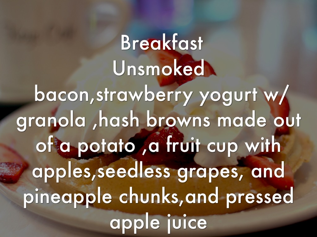 bacon,strawberry yogurt w/ granola ,hash browns made out of a potato ,a fruit cup with apples,seedless grapes, and pineapple chunks,and pressed apple juice