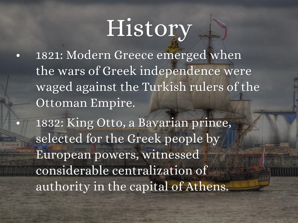 1821: Modern Greece emerged when the wars of Greek independence were waged against the Turkish rulers of the Ottoman Empire.