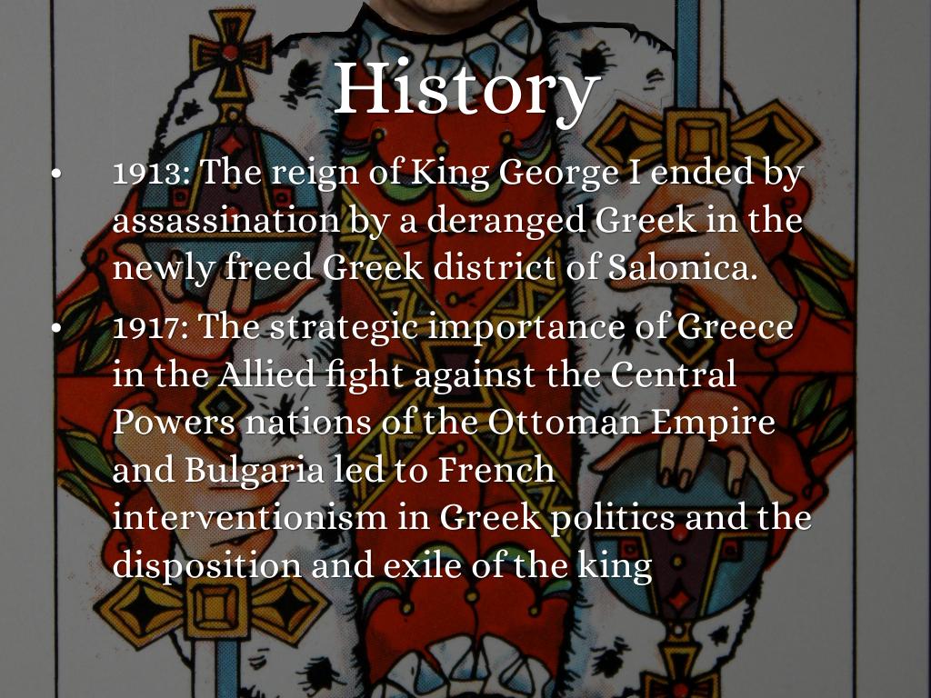 1917: The strategic importance of Greece in the Allied fight against the Central Powers nations of the Ottoman Empire and Bulgaria led to French interventionism in Greek politics and the disposition and exile of the king
