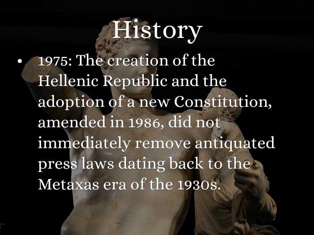 1975: The creation of the Hellenic Republic and the adoption of a new Constitution, amended in 1986, did not immediately remove antiquated press laws dating back to the Metaxas era of the 1930s.