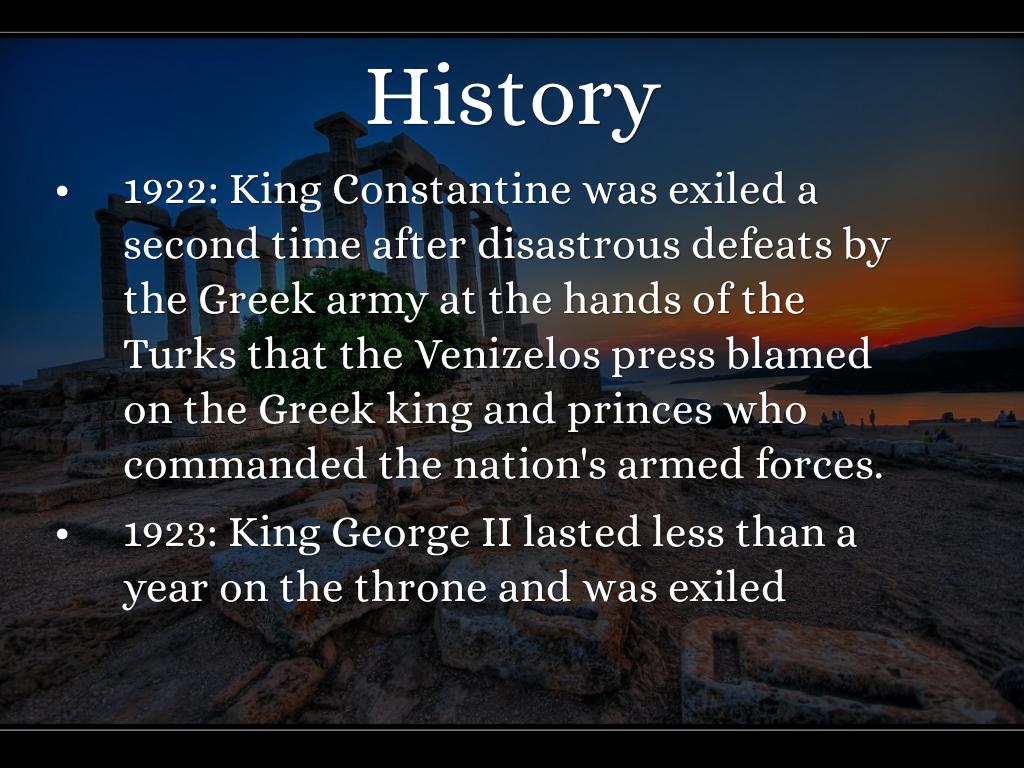 1922: King Constantine was exiled a second time after disastrous defeats by the Greek army at the hands of the Turks that the Venizelos press blamed on the Greek king and princes who commanded the nation's armed forces.