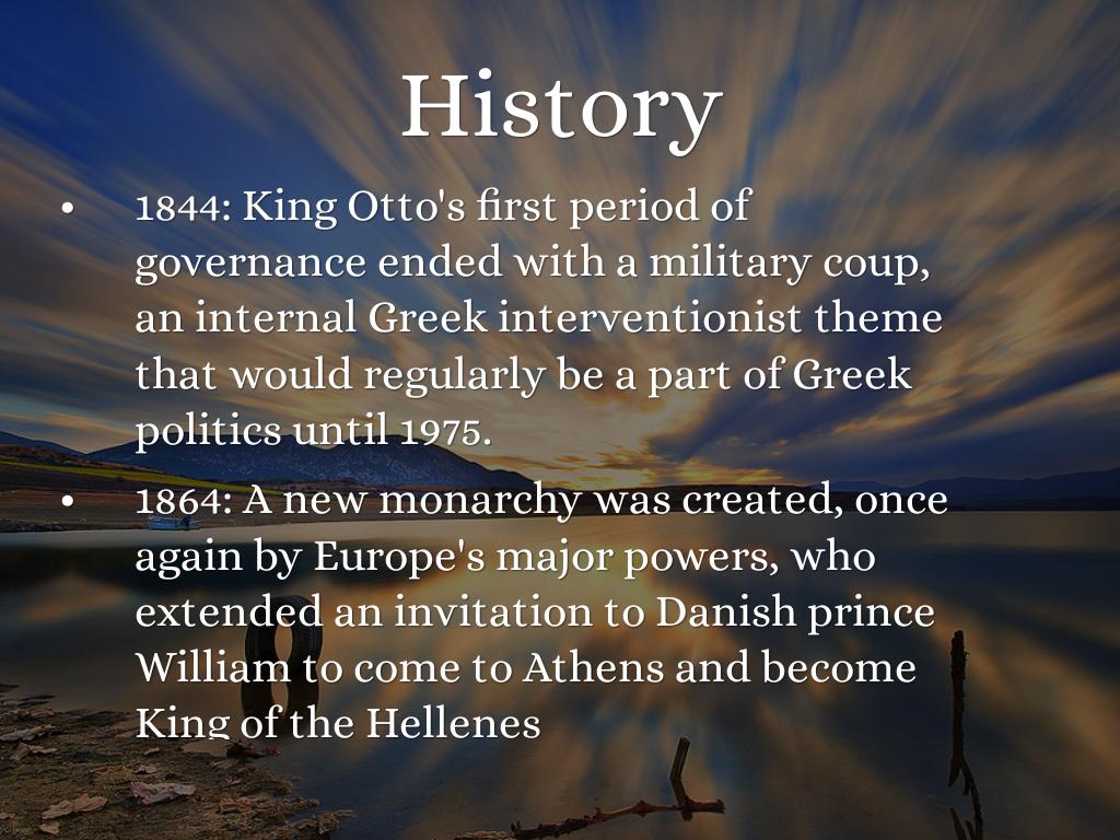 1844: King Otto's first period of governance ended with a military coup, an internal Greek interventionist theme that would regularly be a part of Greek politics until 1975.