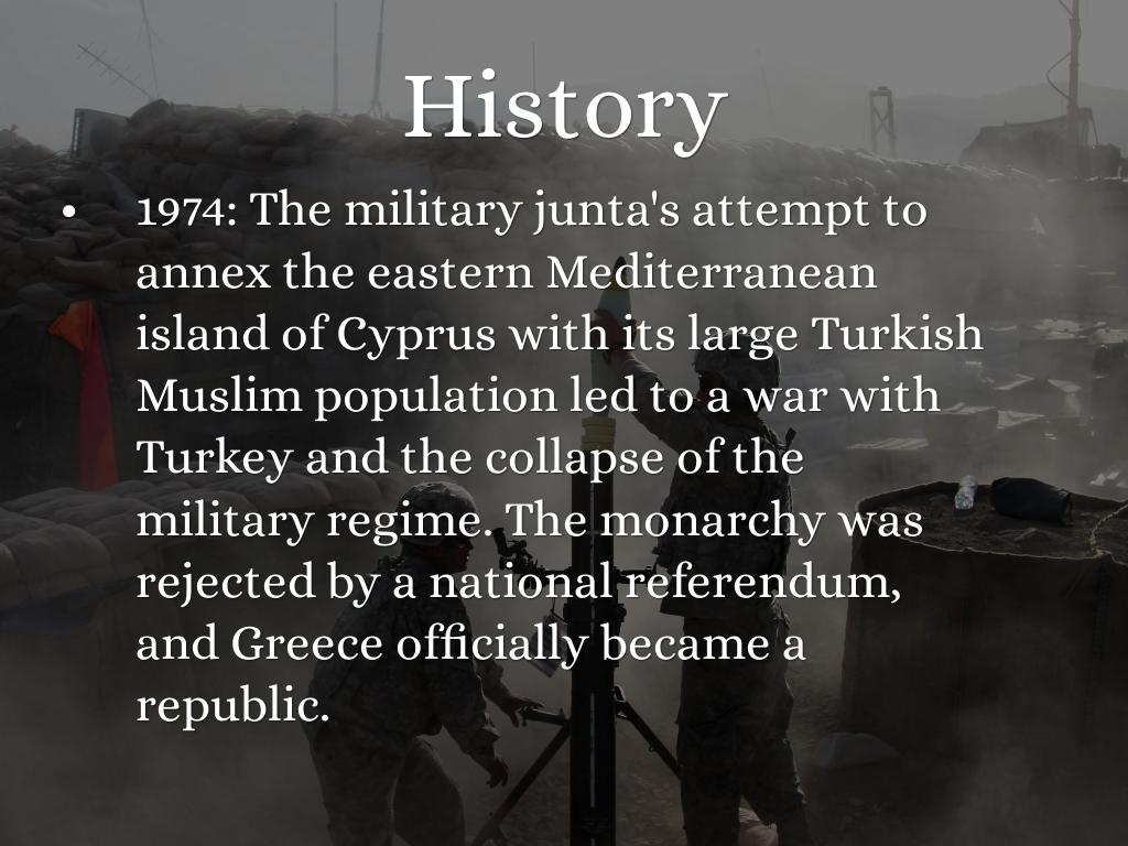 1974: The military junta's attempt to annex the eastern Mediterranean island of Cyprus with its large Turkish Muslim population led to a war with Turkey and the collapse of the military regime. The monarchy was rejected by a national referendum, and Greece officially became a republic.