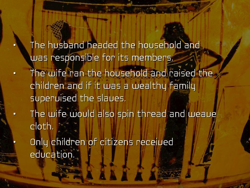 Greek women were permitted to little entertainment outside the home except for religious festivals.