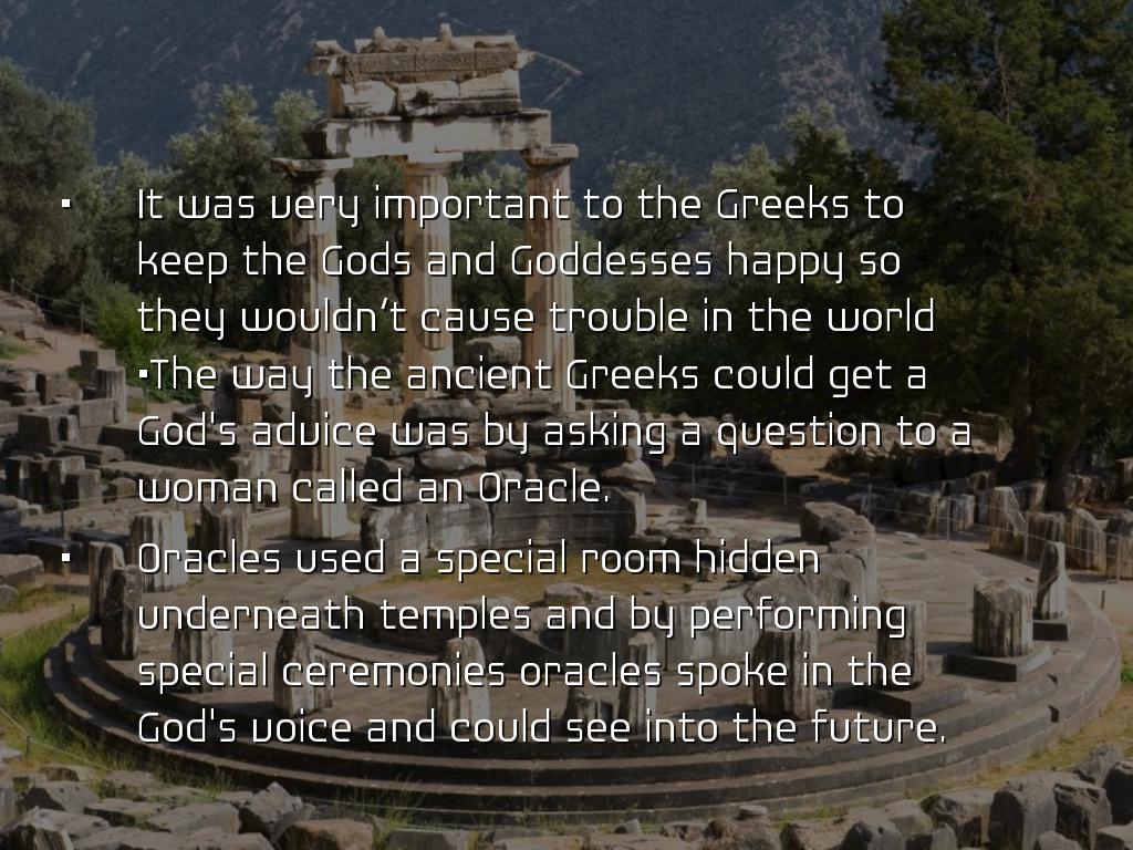 •The way the ancient Greeks could get a God's advice was by asking a question to a woman called an Oracle.