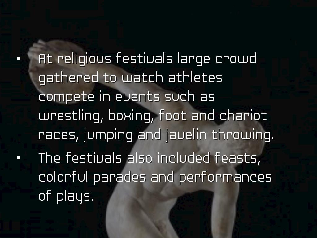 At religious festivals large crowd gathered to watch athletes compete in events such as wrestling, boxing, foot and chariot races, jumping and javelin throwing.