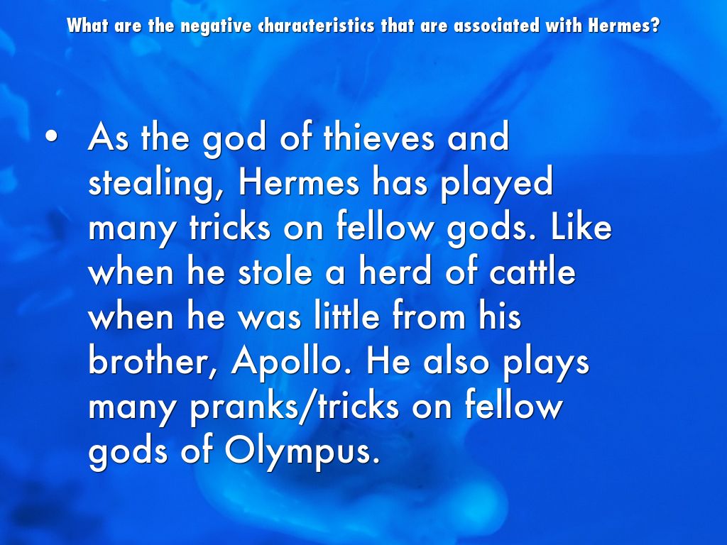 As the god of thieves and stealing, Hermes has played many tricks on fellow gods. Like when he stole a herd of cattle when he was little from his brother, Apollo. He also plays many pranks/tricks on fellow gods of Olympus.