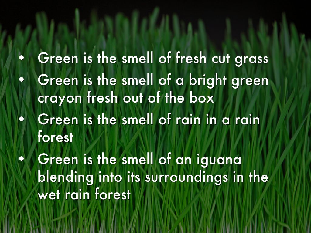 • Green is the smell of an iguana blending into its surroundings in the wet rain forest