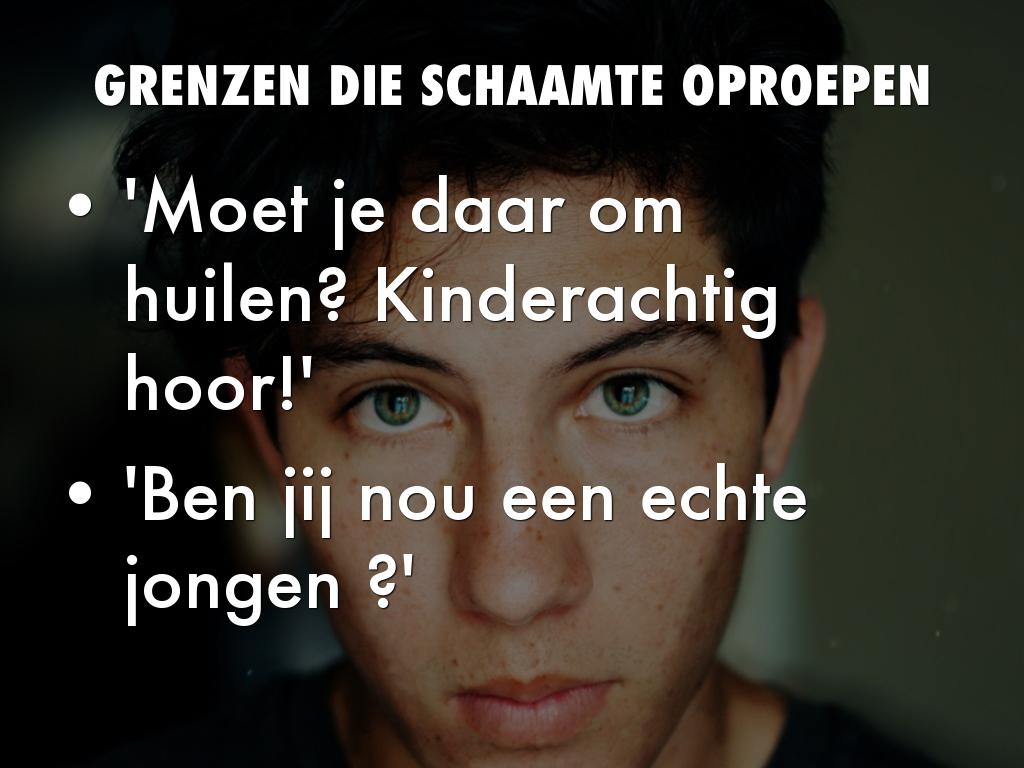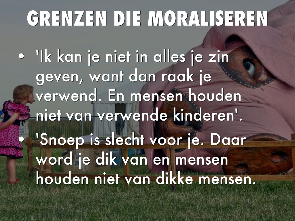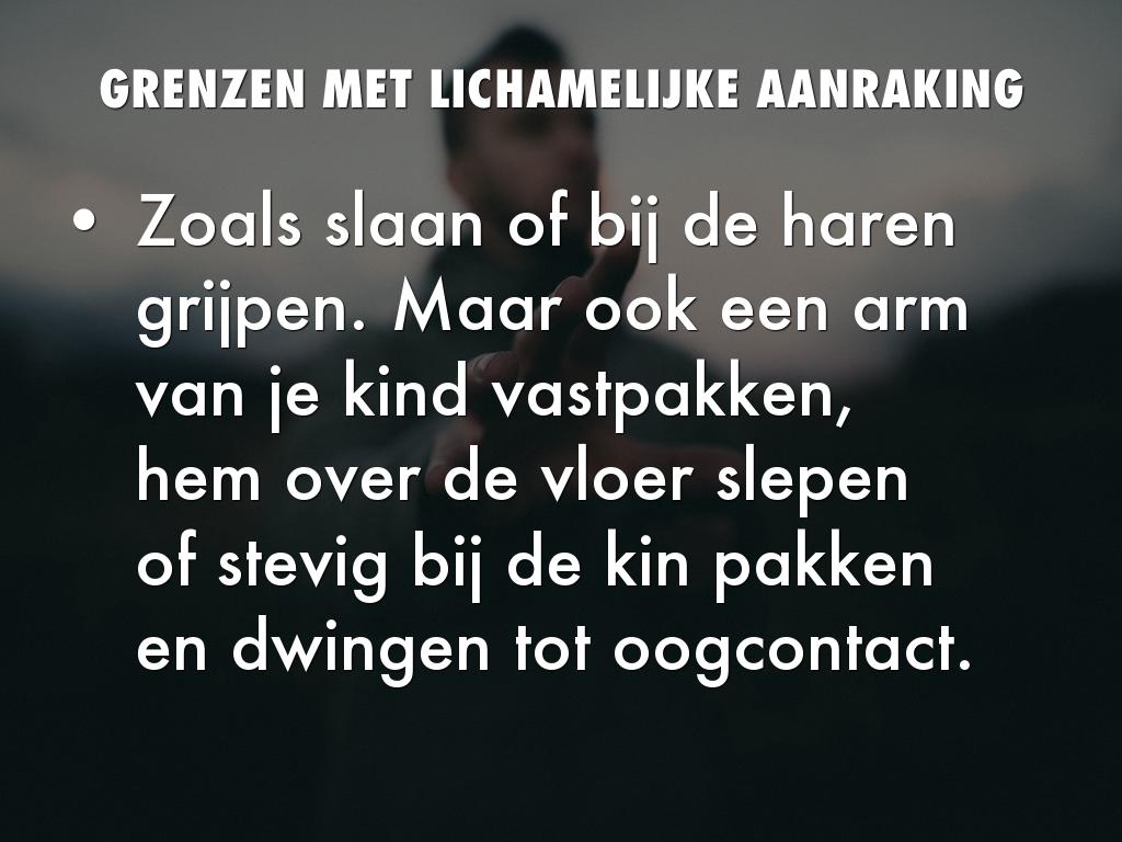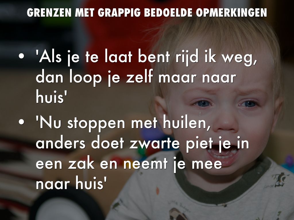 PRESENTATION OUTLINEGRENZEN STELLEN OP EEN EMOTIONEEL BELADEN MANIER Grenzen met een emotionele claim Grenzen die schaamte oproepen Grenzen met een lichamelijke aanraking Grenzen die het zelfbeeld ondermijnen Grenzen met grappig bedoelde opmerkingen Grenzen die moraliseren GRENZEN MET EEN EMOTIONELE CLAIM 'Mama wordt erg verdrietig als je niet luistert' 'Ik doe altijd zo mijn best voor jou, en nog gehoorzaam je niet' GRENZEN DIE SCHAAMTE OPROEPEN 'Moet je daar om huilen? Kinderachtig hoor!' 'Ben jij nou een echte jongen ?' GRENZEN MET LICHAMELIJKE AANRAKING Zoals slaan of bij de haren grijpen. Maar ook een arm van je kind vastpakken, hem over de vloer slepen of stevig bij de kin pakken en dwingen tot oogcontact. GRENZEN DIE HET ZELFBEELD ONDERMIJNEN 'Doe eens normaal' 'Doe niet zo belachelijk' GRENZEN MET GRAPPIG BEDOELDE OPMERKINGEN 'Als je te laat bent rijd ik weg, dan loop je zelf maar naar huis' 'Nu stoppen met huilen, anders doet zwarte piet je in een zak en neemt je mee naar huis' GRENZEN DIE MORALISEREN 'Ik kan je niet in alles je zin geven, want dan raak je verwend. En mensen houden niet van verwende kinderen'. 'Snoep is slecht voor je. Daar word je dik van en mensen houden niet van dikke mensen. Haiku Deck Pro User