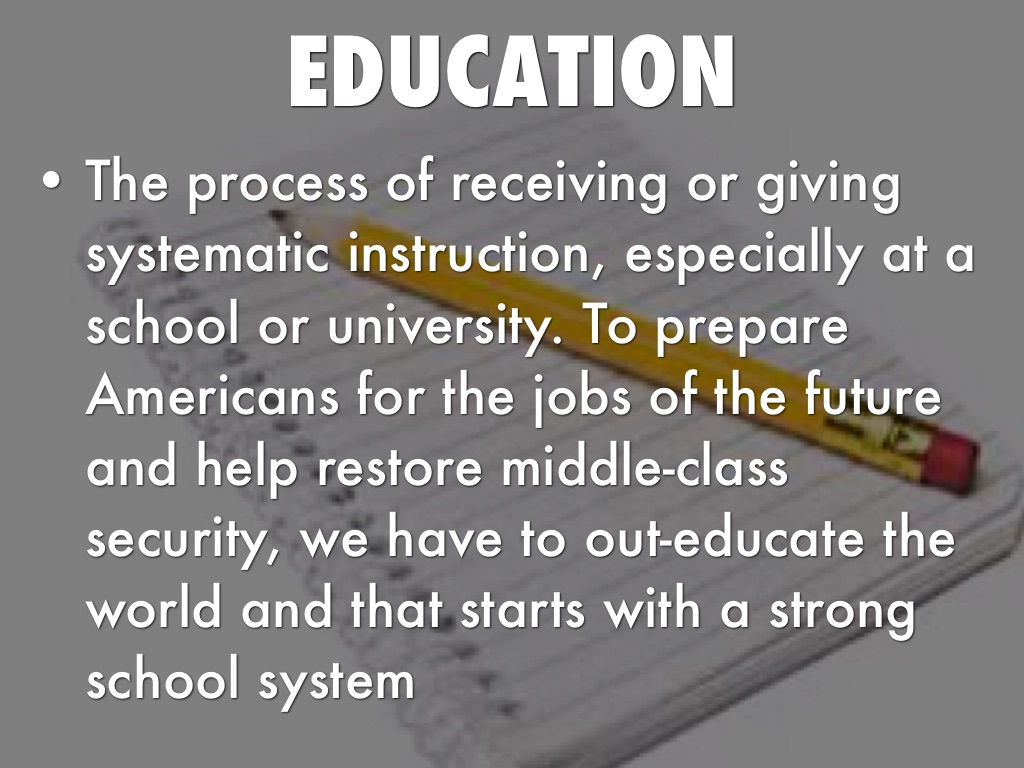 The process of receiving or giving systematic instruction, especially at a school or university. To prepare Americans for the jobs of the future and help restore middle-class security, we have to out-educate the world and that starts with a strong school system