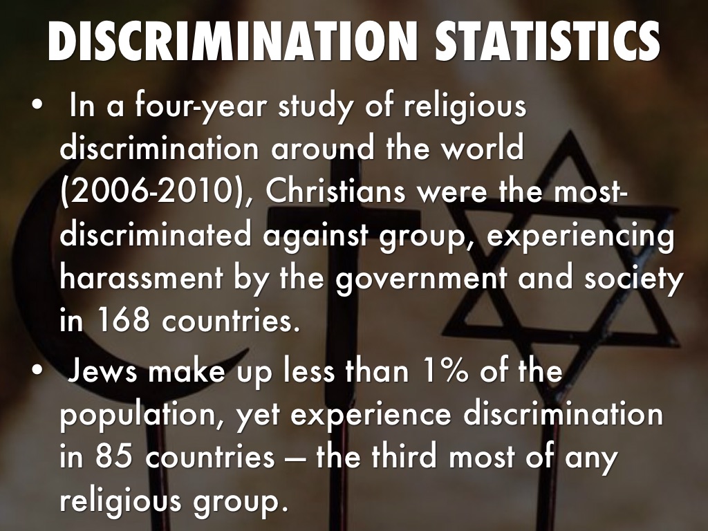 In a four-year study of religious discrimination around the world (2006-2010), Christians were the most-discriminated against group, experiencing harassment by the government and society in 168 countries.