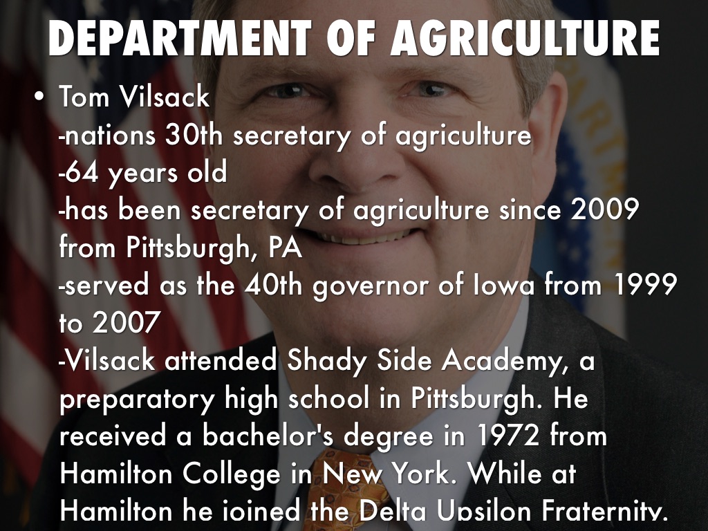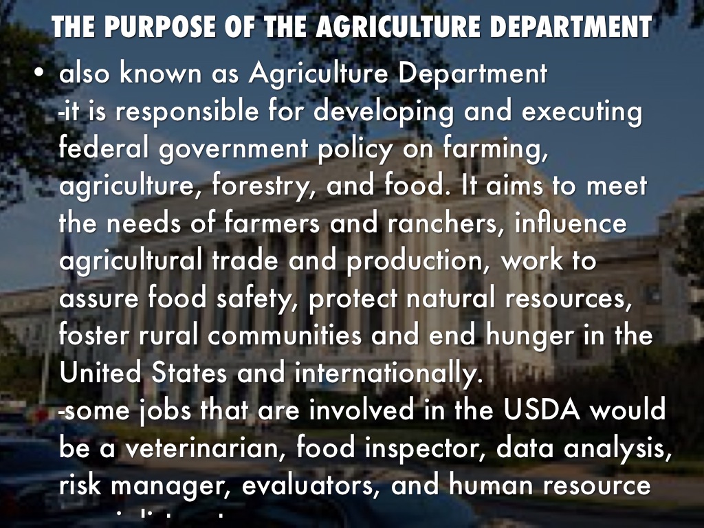 -it is responsible for developing and executing federal government policy on farming, agriculture, forestry, and food. It aims to meet the needs of farmers and ranchers, influence agricultural trade and production, work to assure food safety, protect natural resources, foster rural communities and end hunger in the United States and internationally.