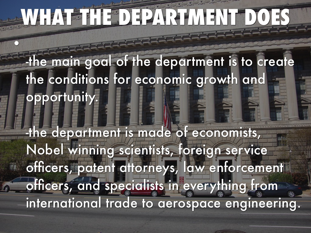 -the department is made of economists, Nobel winning scientists, foreign service officers, patent attorneys, law enforcement officers, and specialists in everything from international trade to aerospace engineering.