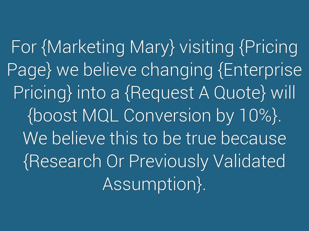 For {Marketing Mary} visiting {Pricing Page} we believe changing {Enterprise Pricing} into a {Request A Quote} will {boost MQL Conversion by 10%}. We believe this to be true because {Research Or Previously Validated Assumption}.