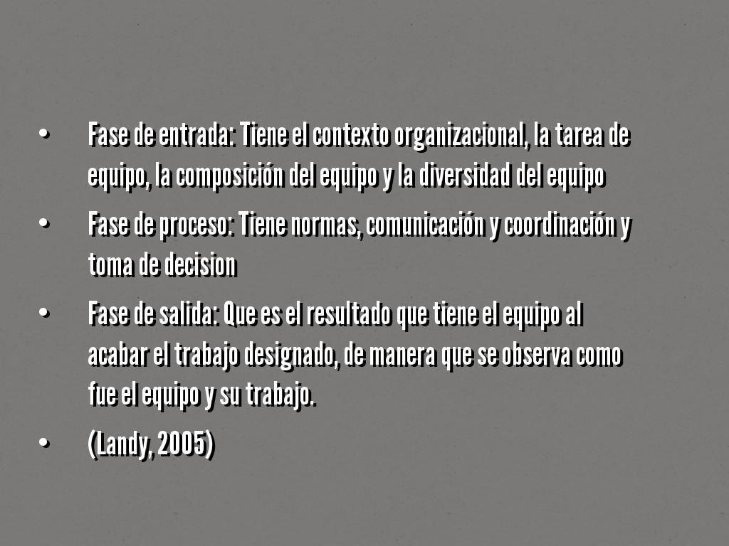 • Fase de entrada: Tiene el contexto organizacional, la tarea de equipo, la composición del equipo y la diversidad del equipo