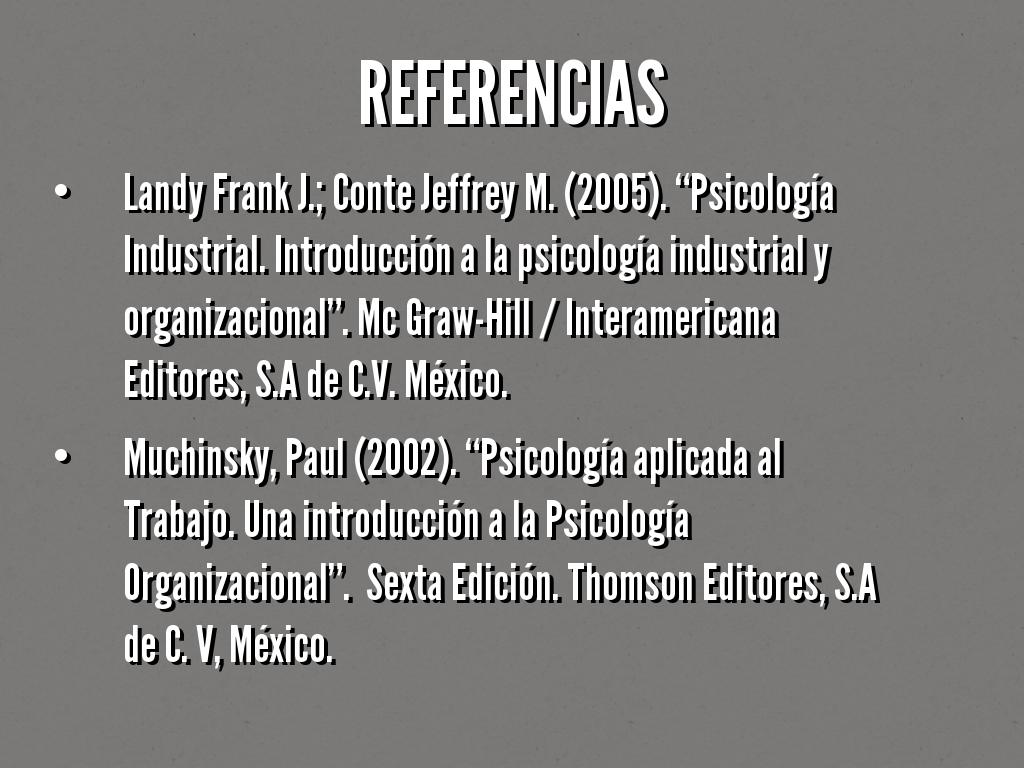 • Landy Frank J.; Conte Jeffrey M. (2005). “Psicología Industrial. Introducción a la psicología industrial y organizacional”. Mc Graw-Hill / Interamericana Editores, S.A de C.V. México.