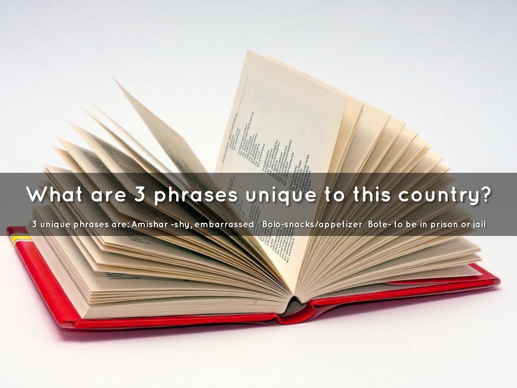 3 unique phrases are: Amishar -shy, embarrassed Bolo-snacks/appetizer Bote- to be in prison or jail