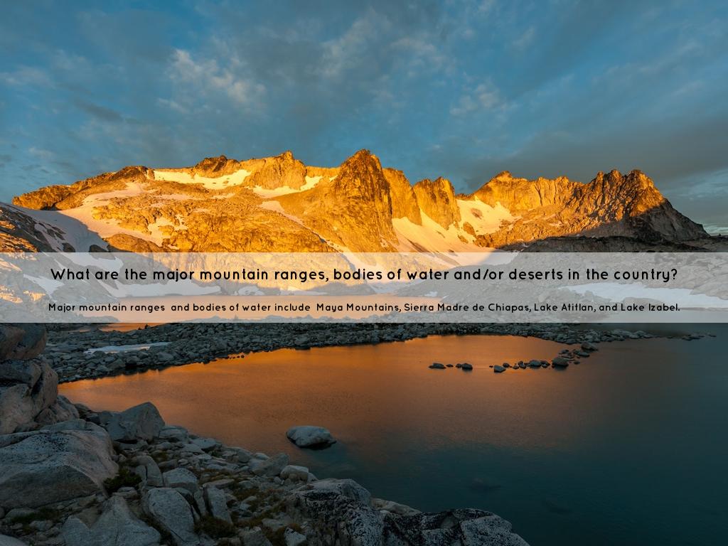 Major mountain ranges and bodies of water include Maya Mountains, Sierra Madre de Chiapas, Lake Atitlan, and Lake Izabel.
