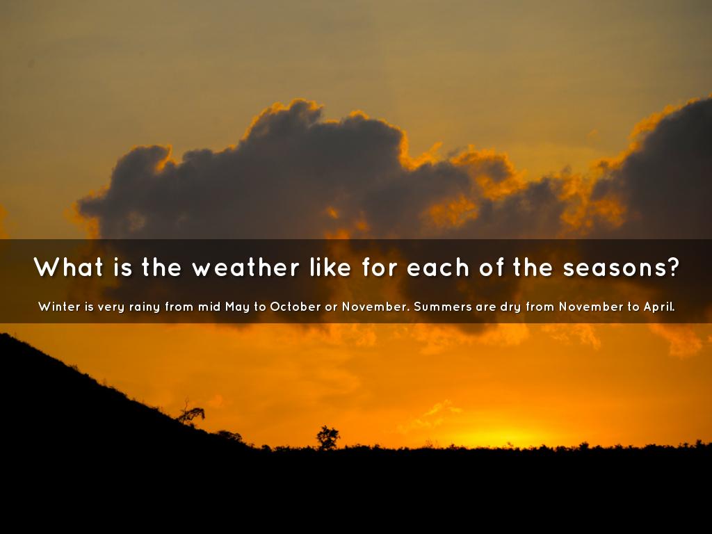 Winter is very rainy from mid May to October or November. Summers are dry from November to April.