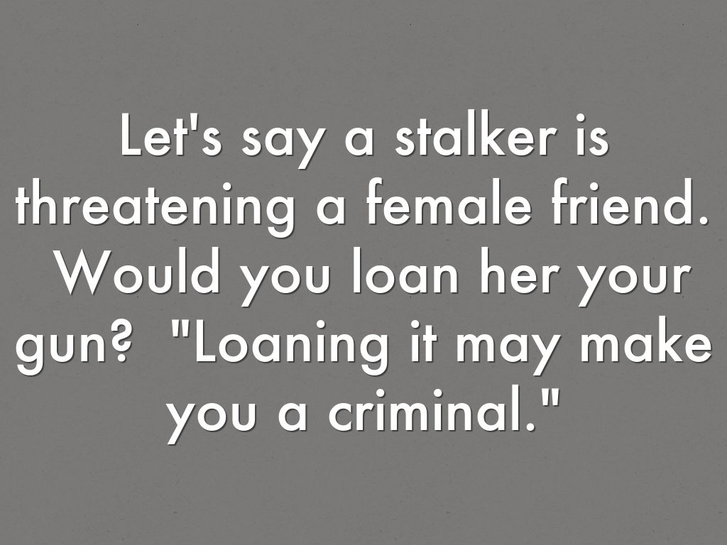 Let's say a stalker is threatening a female friend. Would you loan her your gun? "Loaning it may make you a criminal."