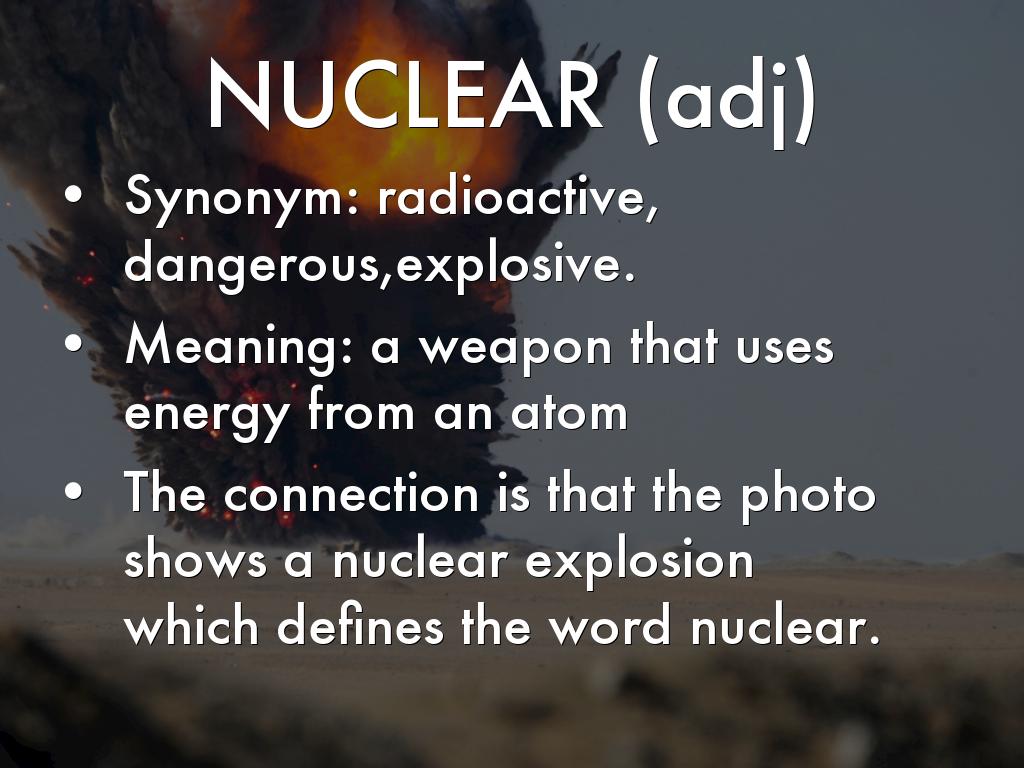 The connection is that the photo shows a nuclear explosion which defines the word nuclear.