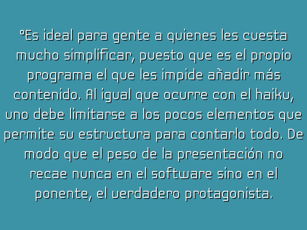 °Es ideal para gente a quienes les cuesta mucho simplificar, puesto que es el propio programa el que les impide añadir más contenido. Al igual que ocurre con el haiku, uno debe limitarse a los pocos elementos que permite su estructura para contarlo todo. De modo que el peso de la presentación no recae nunca en el software sino en el ponente, el verdadero protagonista.
