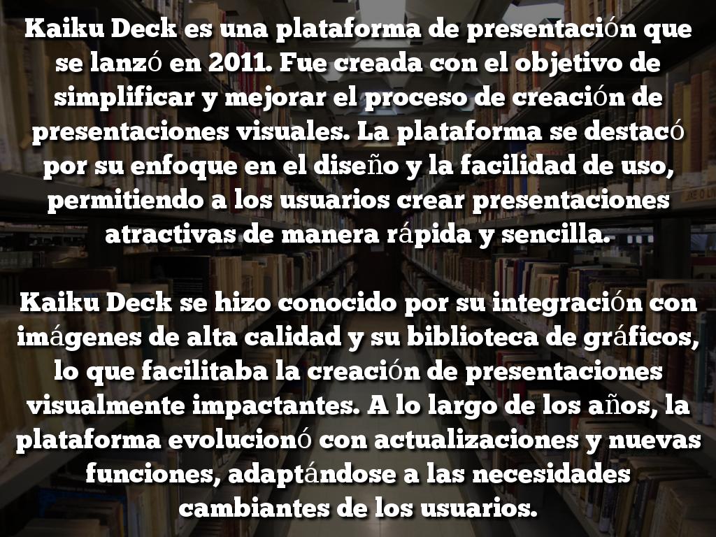 Kaiku Deck es una plataforma de presentación que se lanzó en 2011. Fue creada con el objetivo de simplificar y mejorar el proceso de creación de presentaciones visuales. La plataforma se destacó por su enfoque en el diseño y la facilidad de uso, permitiendo a los usuarios crear presentaciones atractivas de manera rápida y sencilla.