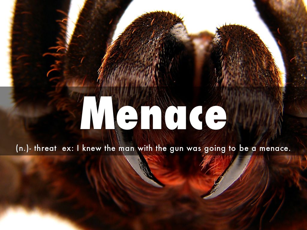 (n.)- threat ex: I knew the man with the gun was going to be a menace.
