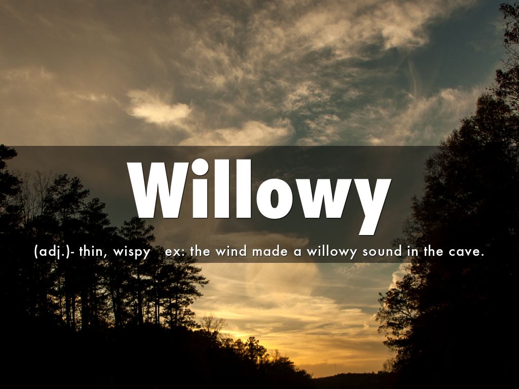 (adj.)- thin, wispy ex: the wind made a willowy sound in the cave.