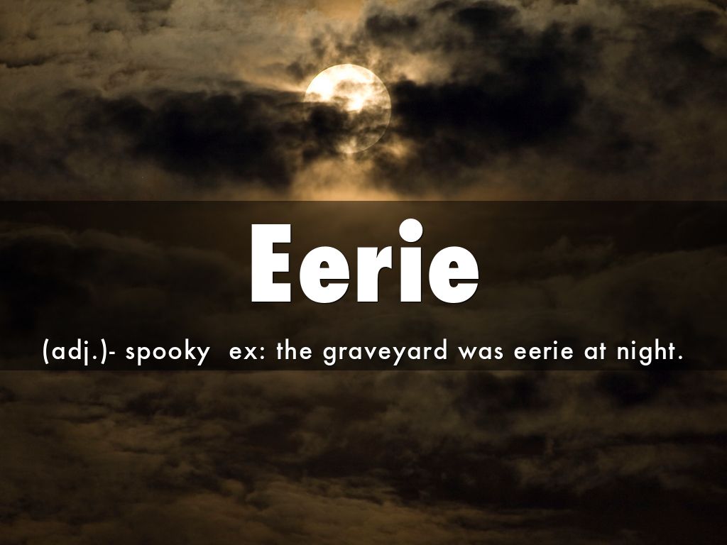 (adj.)- spooky ex: the graveyard was eerie at night.