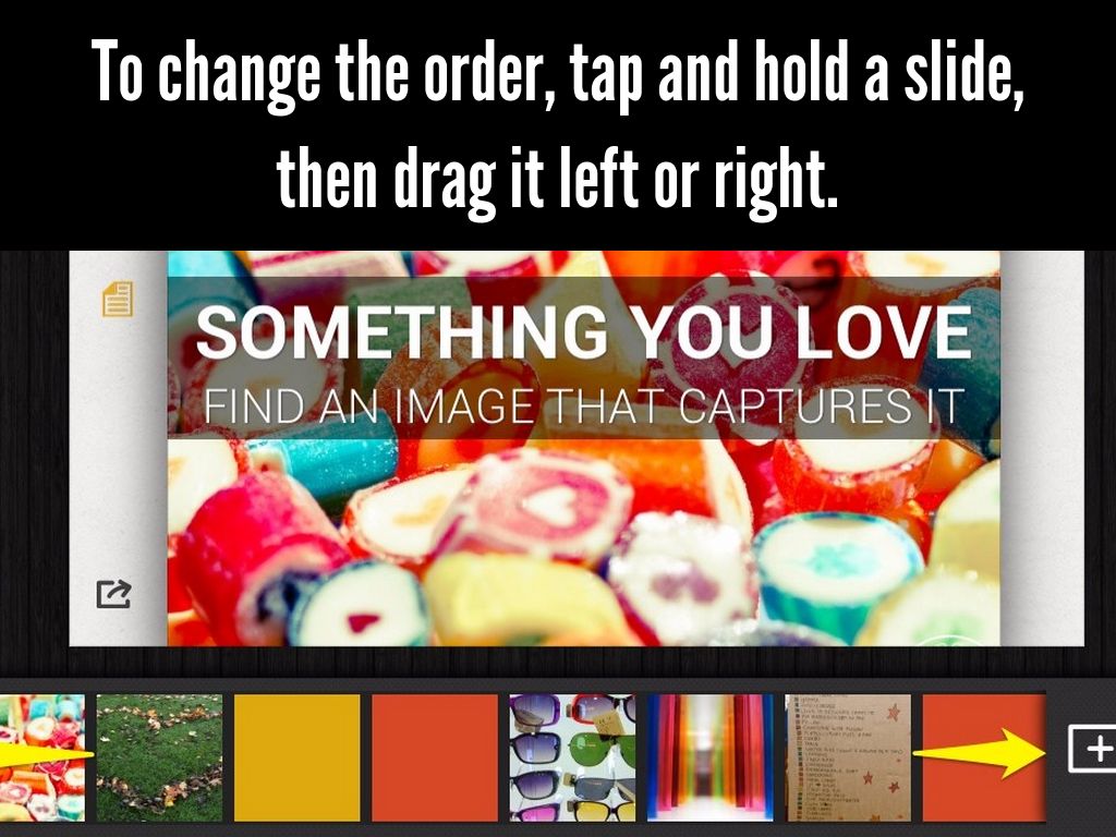 To delete a slide, tap the gear in the top right corner, then DELETE.