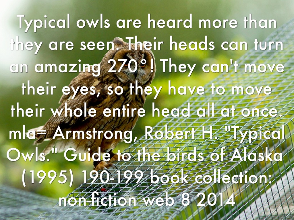 Typical owls are heard more than they are seen. Their heads can turn an amazing 270°! They can't move their eyes, so they have to move their whole entire head all at once. mla= Armstrong, Robert H. "Typical Owls." Guide to the birds of Alaska (1995) 190-199 book collection: non-fiction web 8 2014