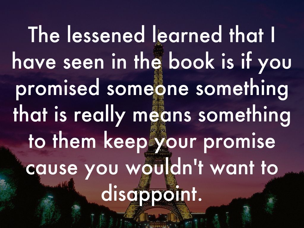 The lessened learned that I have seen in the book is if you promised someone something that is really means something to them keep your promise cause you wouldn't want to disappoint.