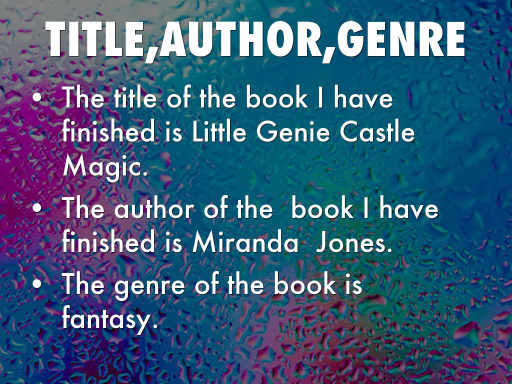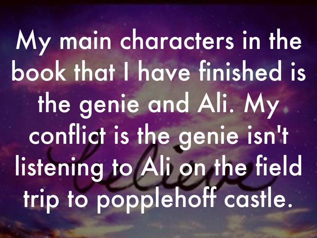 My main characters in the book that I have finished is the genie and Ali. My conflict is the genie isn't listening to Ali on the field trip to popplehoff castle.