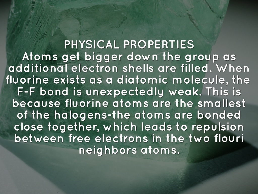 Atoms get bigger down the group as additional electron shells are filled. When fluorine exists as a diatomic molecule, the F-F bond is unexpectedly weak. This is because fluorine atoms are the smallest of the halogens-the atoms are bonded close together, which leads to repulsion between free electrons in the two flouri neighbors atoms.