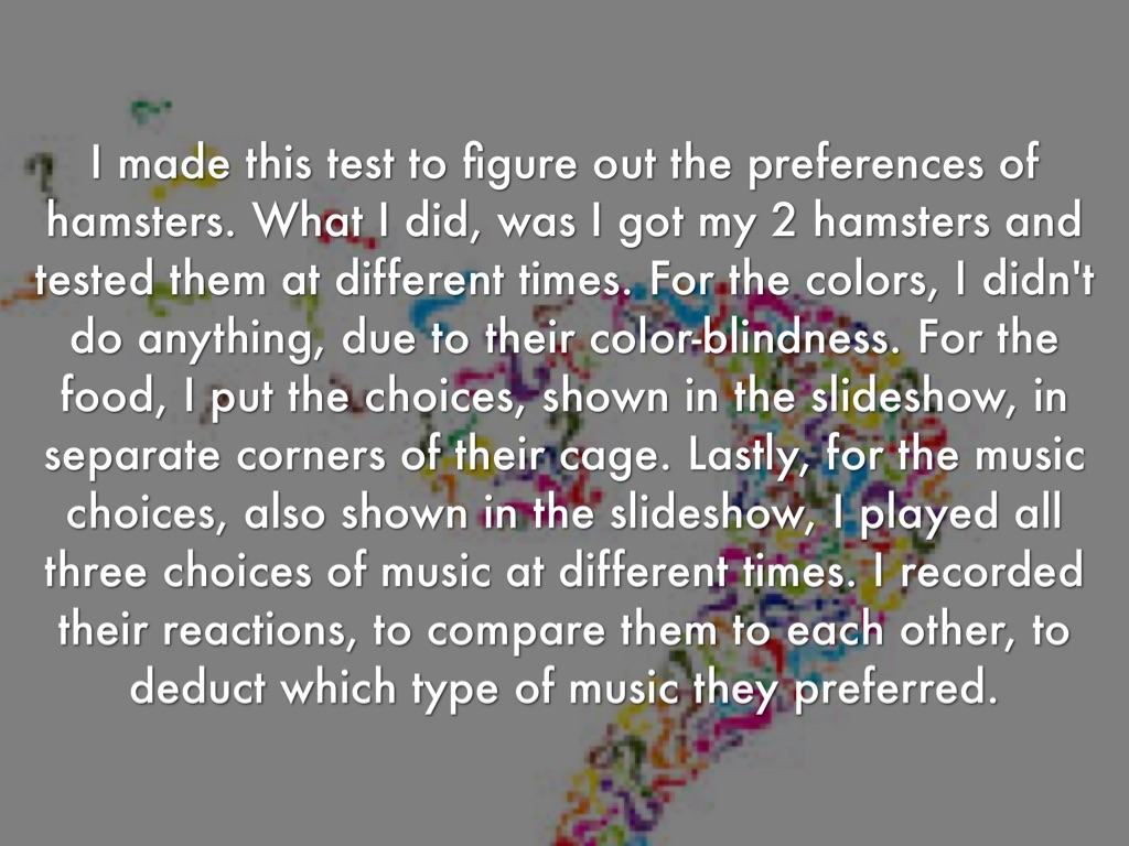 I made this test to figure out the preferences of hamsters. What I did, was I got my 2 hamsters and tested them at different times. For the colors, I didn't do anything, due to their color-blindness. For the food, I put the choices, shown in the slideshow, in separate corners of their cage. Lastly, for the music choices, also shown in the slideshow, I played all three choices of music at different times. I recorded their reactions, to compare them to each other, to deduct which type of music they preferred.