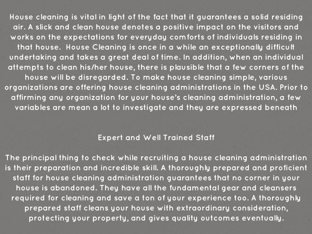 House cleaning is vital in light of the fact that it guarantees a solid residing air. A slick and clean house denotes a positive impact on the visitors and works on the expectations for everyday comforts of individuals residing in that house. House cleaning is once in a while an exceptionally difficult undertaking and takes a great deal of time. In addition, when an individual attempts to clean his/her house, there is plausible that a few corners of the house will be disregarded. To make house cleaning simple, various organizations are offering house cleaning administrations in USA. Prior to affirming any organization for your house’s cleaning administration, a few variables are mean a lot to investigate and they are expressed beneath