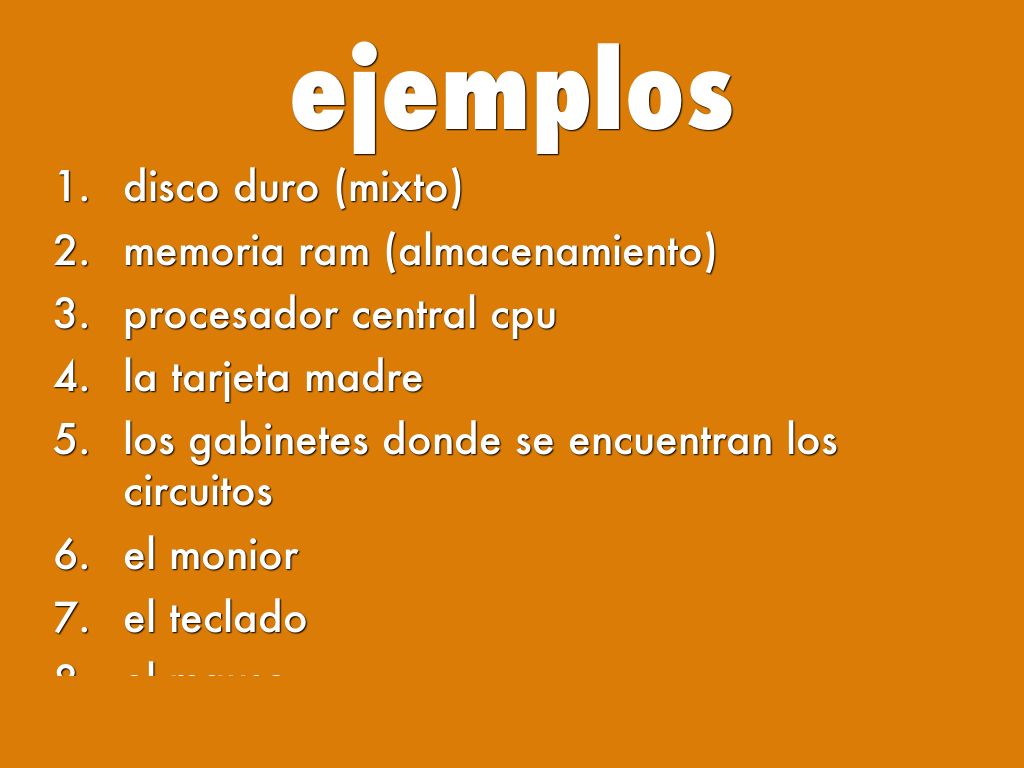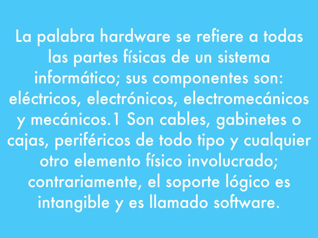 La palabra hardware se refiere a todas las partes físicas de un sistema informático; sus componentes son: eléctricos, electrónicos, electromecánicos y mecánicos.1 Son cables, gabinetes o cajas, periféricos de todo tipo y cualquier otro elemento físico involucrado; contrariamente, el soporte lógico es intangible y es llamado software.