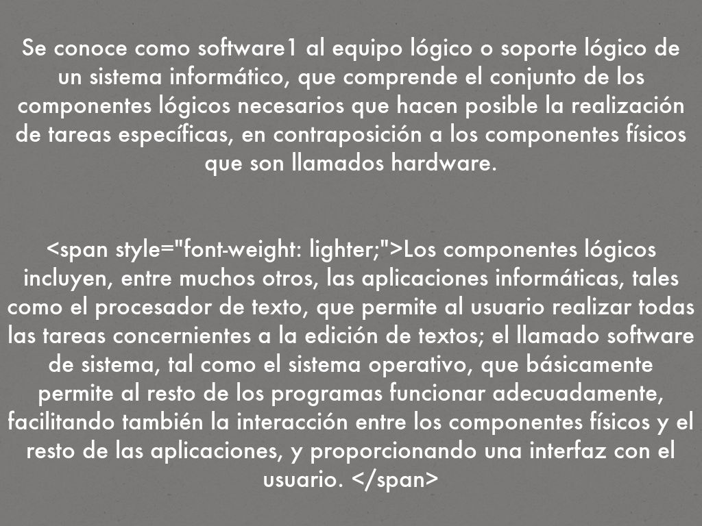 Se conoce como software1 al equipo lógico o soporte lógico de un sistema informático, que comprende el conjunto de los componentes lógicos necesarios que hacen posible la realización de tareas específicas, en contraposición a los componentes físicos que son llamados hardware.