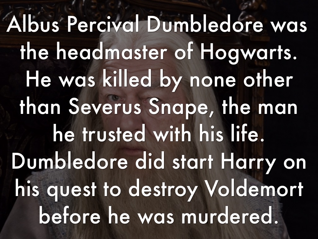 Albus Percival Dumbledore was the headmaster of Hogwarts. He was killed by none other than Severus Snape, the man he trusted with his life. Dumbledore did start Harry on his quest to destroy Voldemort before he was murdered.