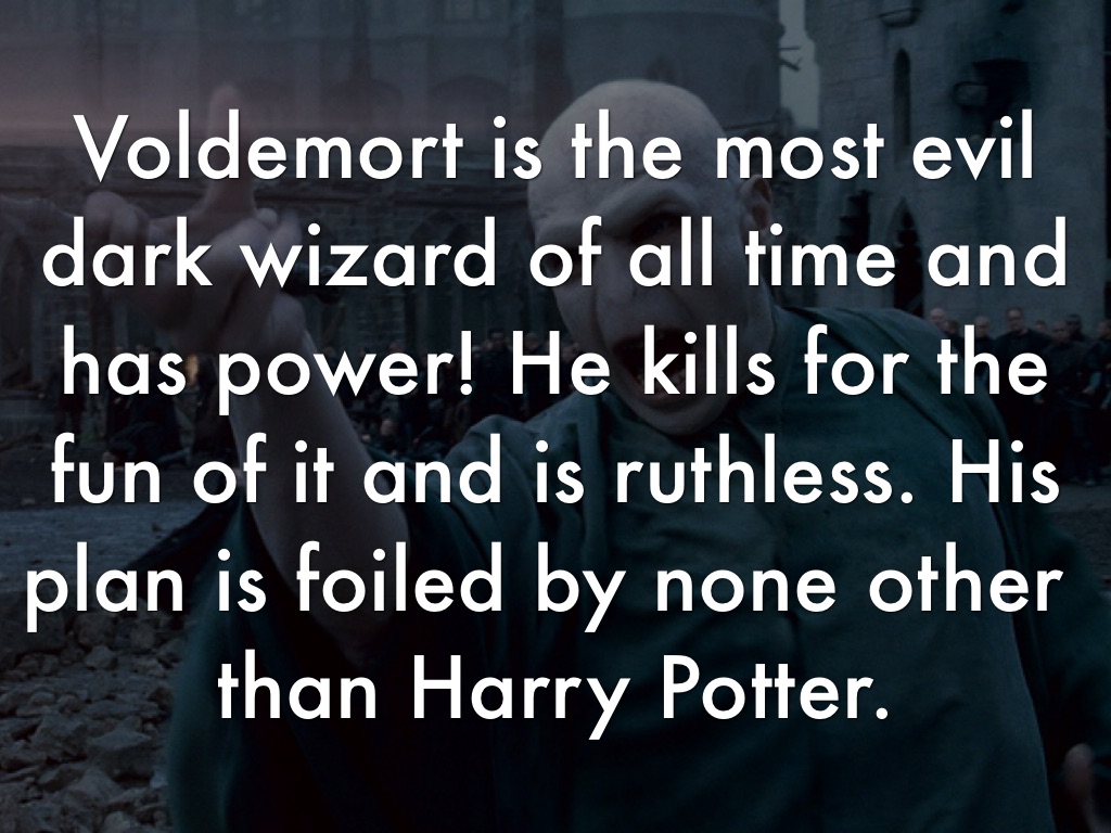 Voldemort is the most evil dark wizard of all time and has power! He kills for the fun of it and is ruthless. His plan is foiled by none other than Harry Potter.