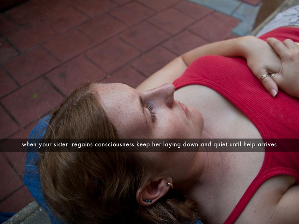 when your sister  regains consciousness keep her laying down and quiet until help arrives