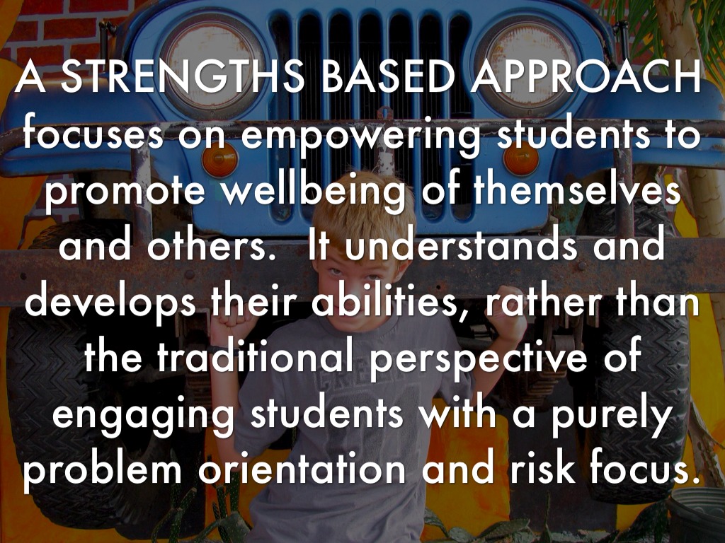 A STRENGTHS BASED APPROACH focuses on empowering students to promote wellbeing of themselves and others. It understands and develops their abilities, rather than the traditional perspective of engaging students with a purely problem orientation and risk focus.