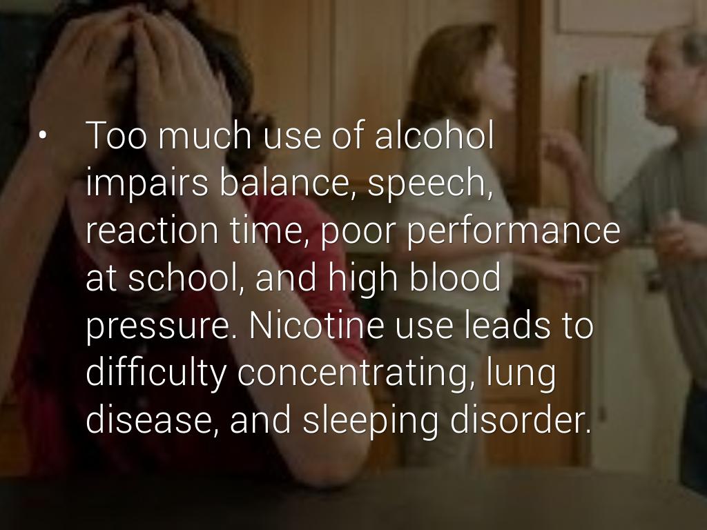 Too much use of alcohol impairs balance, speech, reaction time, poor performance at school, and high blood pressure. Nicotine use leads to difficulty concentrating, lung disease, and sleeping disorder.