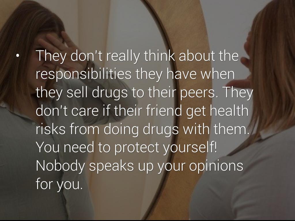 They don’t really think about the responsibilities they have when they sell drugs to their peers. They don’t care if their friend get health risks from doing drugs with them. You need to protect yourself! Nobody speaks up your opinions for you.