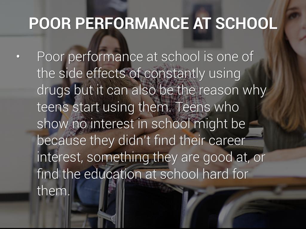 Poor performance at school is one of the side effects of constantly using drugs but it can also be the reason why teens start using them. Teens who show no interest in school might be because they didn’t find their career interest, something they are good at, or find the education at school hard for them.