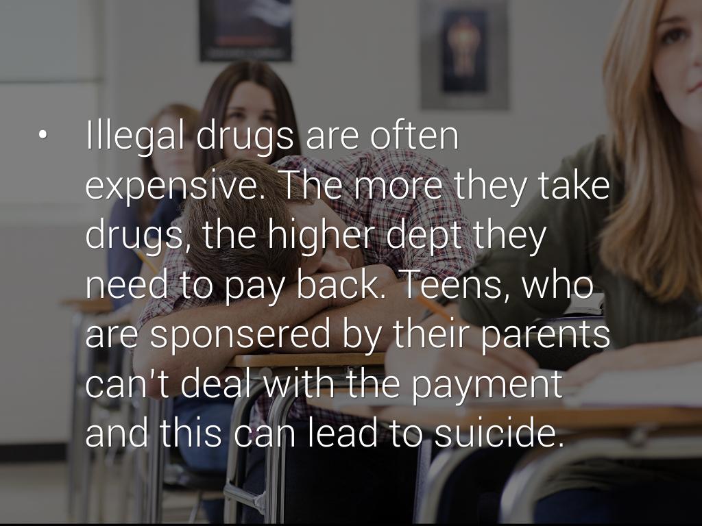 Illegal drugs are often expensive. The more they take drugs, the higher dept they need to pay back. Teens, who are sponsered by their parents can’t deal with the payment and this can lead to suicide.