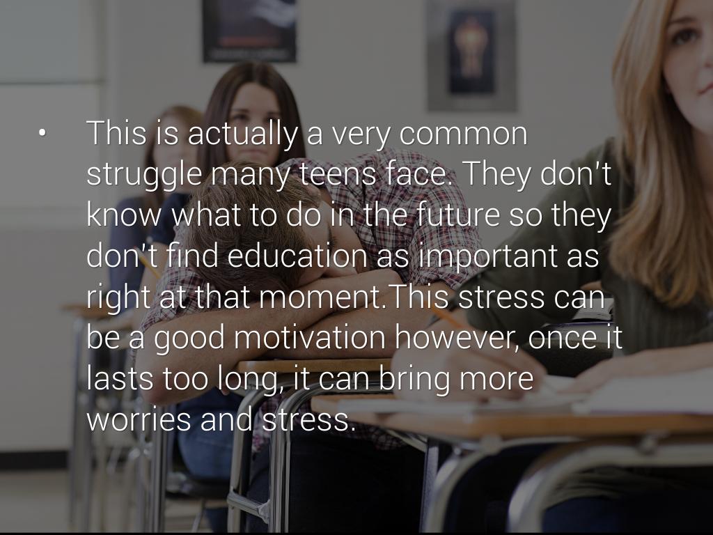 This is actually a very common struggle many teens face. They don’t know what to do in the future so they don’t find education as important as right at that moment.This stress can be a good motivation however, once it lasts too long, it can bring more worries and stress.